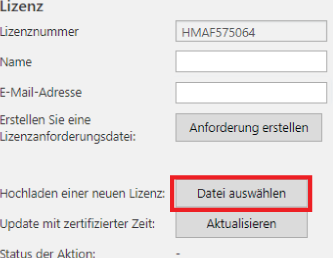 Wenn Sie eine neue Lizenzdatei ([Hardware-key-ID]-licensefile.zip) erhalten haben, können Sie diese Datei hochladen und damit die Lizenzaktivierung abschließen.