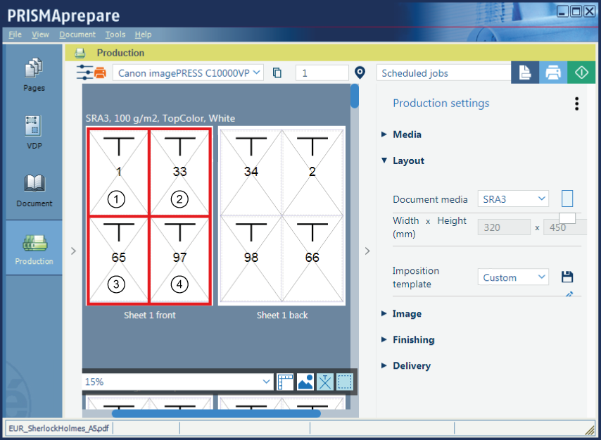In this exercise, you print the double-sided pages of an A5 document on SRA3 media efficiently. After offline cutting, the four stacks can be put on top of each other to form the complete book with a correct order of the pages.