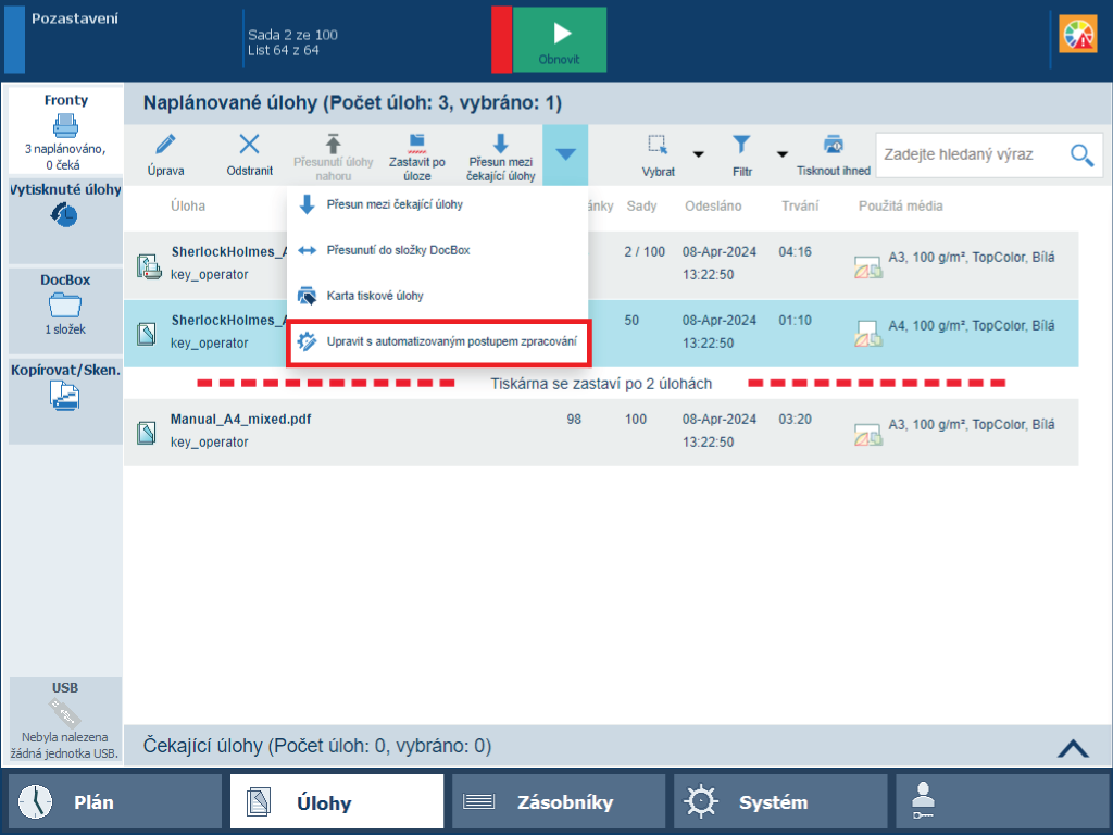 Když je vybrán předdefinovaný automatizovaný postup zpracování a přepsání lístku úlohy je povoleno, má větší prioritu nastavení automatizovaného postupu zpracování. Příklad: Lístek má média A3, automatizovaný postup zpracování má média A4 => výsledná média budou A4.
