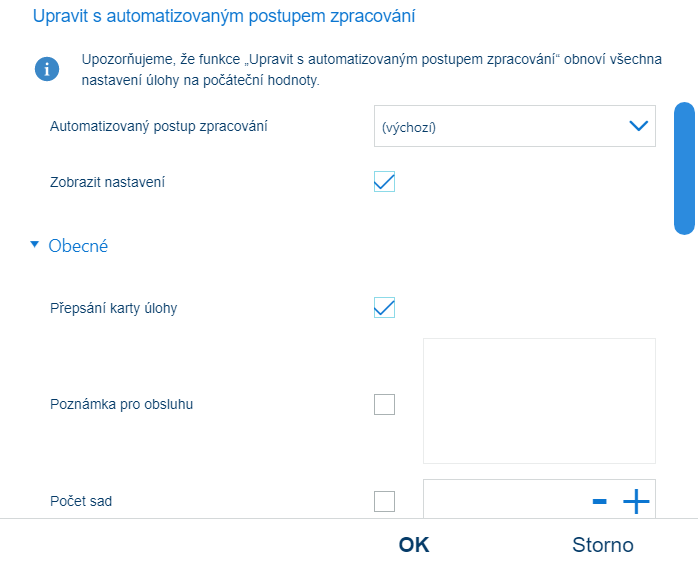 Upozorňujeme, že funkce [Upravit s automatizovaným postupem zpracování] obnoví všechna nastavení úlohy na počáteční hodnoty.