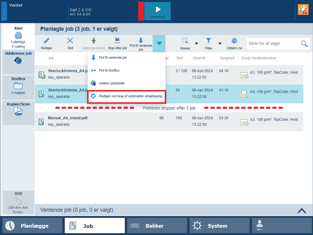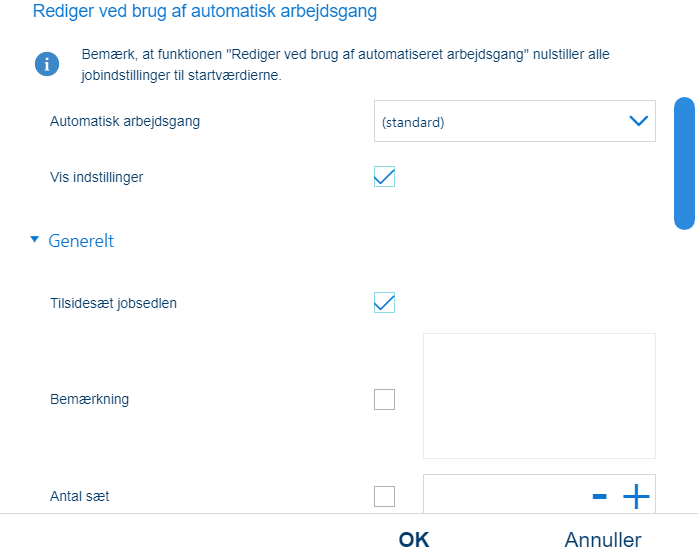 Når en foruddefineret automatisk arbejdsgang vælges og tilsidesætter jobseddel = aktiveret, har de automatiske indstillinger for arbejdsgangen større prioritet. Eksempel: Jobseddel har medie A3, automatisk arbejdsgang har medie A4 => resultat Medie A4