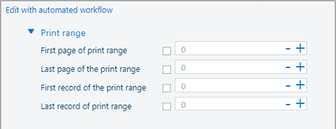 可変データジョブの文書の一部を印刷する場合は、印刷範囲の最後のページ番号を入力します。最初のレコードを入力しないと、範囲は最初のレコードからになります。 |