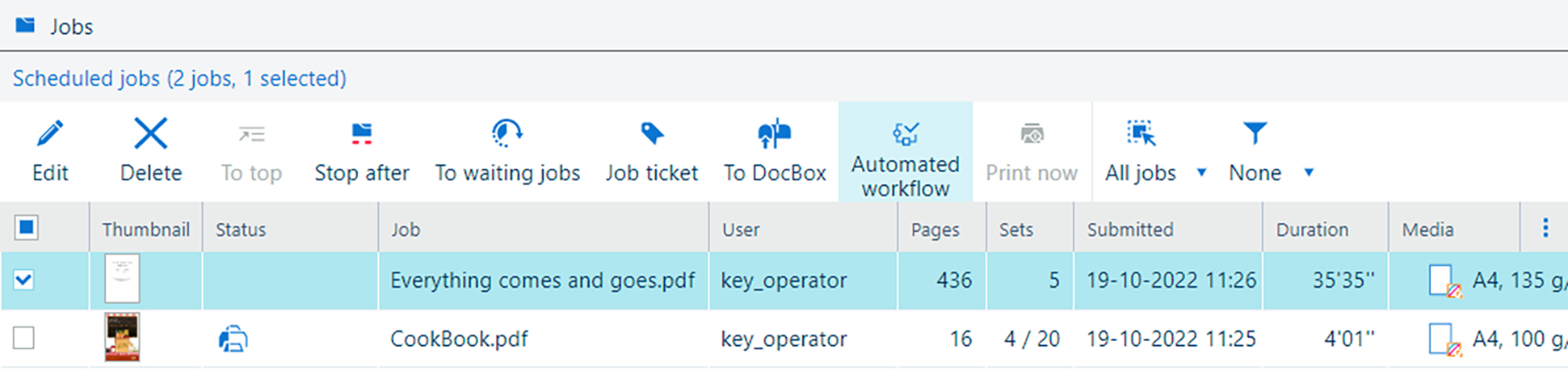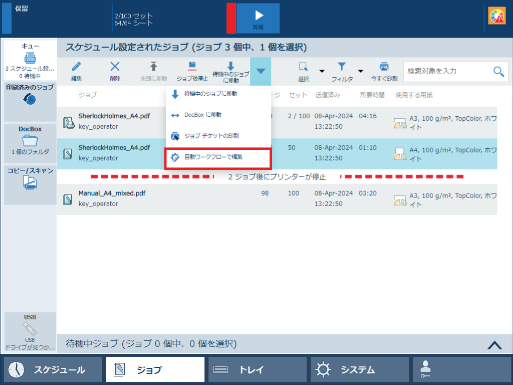 事前定義された自動ワークフローが選択され、[ジョブチケットを無効にする] を [無効] にすると、チケット設定が優先されます。例: チケットに用紙 A3 があり、自動ワークフローに用紙 A4 がある場合は、用紙 A3 が優先されます。