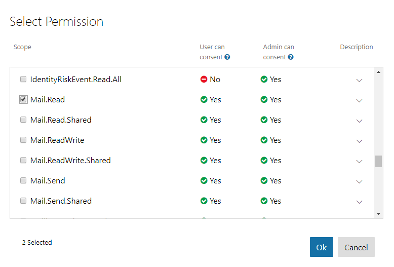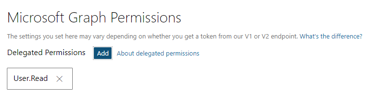 Rulla till avsnittet Microsoft Graph-behörigheter och klicka på Lägg till vid Delegerade behörigheter.