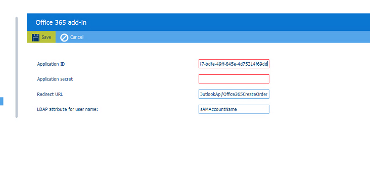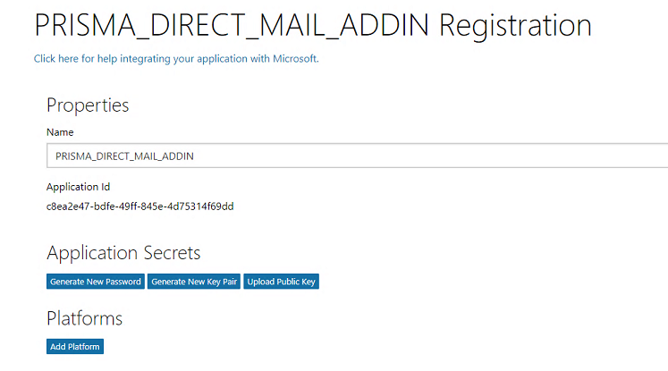 Under registreringen genererar Microsoft [Program-ID] och [Programhemlighet]. :[Styr om URL] är alltid tillgänglig i PRISMAdirect. Du behöver dessa inställningar för att integrera Office 365 med PRISMAdirect.