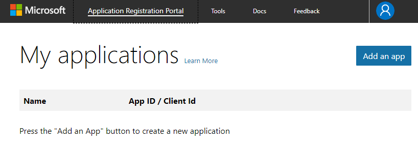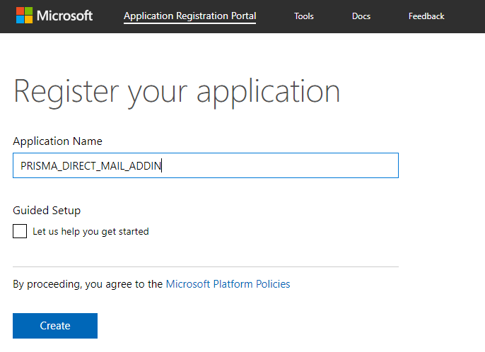 Skriv ett namn på appen och klicka på Create. Namnet används internt av Microsoft och visas inte för kunder.