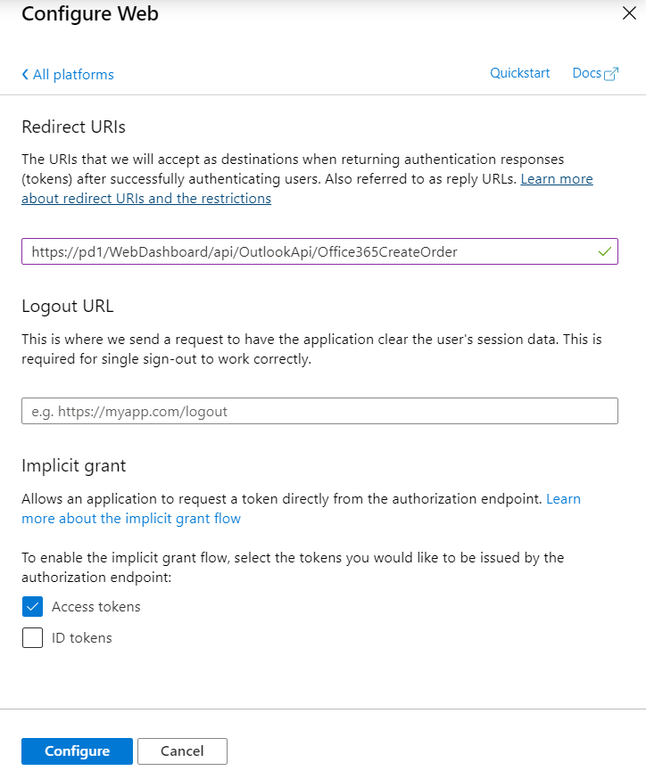 V PRISMAdirect, klikněte na možnost a zkopírujte adresu URL z „Přesměrovat adresu URL“ a vložte ji do „Přesměrovat URI“ z aplikace Microsoft.