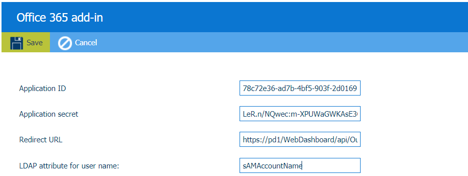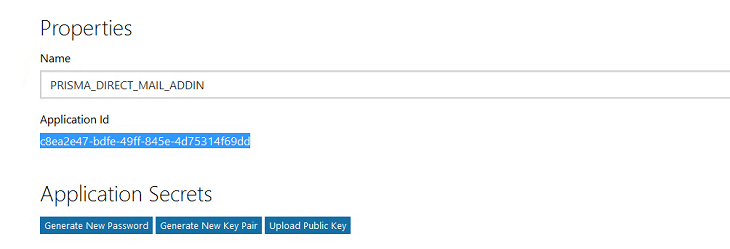 Během registrace Microsoft vygeneruje [ID aplikace] a [Tajemství aplikace]. Aplikace PRISMAdirect vždy obsahuje [Přesměrovat adresu URL]. Všechna tato nastavení jsou potřebná k integraci prostředí Office 365 s aplikací PRISMAdirect.