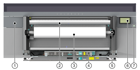 Z výstupní strany média můžete získat přístup k ovládacímu panelu, odvíječi rolí, odebírat své výtisky nebo vyměnit nůž.