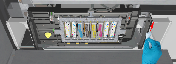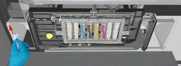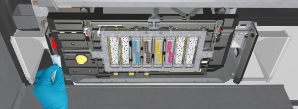 Při práci, kdy hrozí kontakt s inkoustem nebo materiály pro údržbu, noste předepsané ochranné rukavice. Rukavice musí být vždy převléknuty přes rukávy. V zájmu zabezpečení maximální bezpečnosti striktně dodržujte pokyny v bezpečnostních datových listech (SDS).