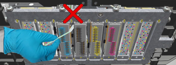 Vždy ji otírejte tampónem směrem od vás, abyste minimalizovali riziko dotyku trysek. Nikdy ji neotírejte v opačném směru (směrem k vám).