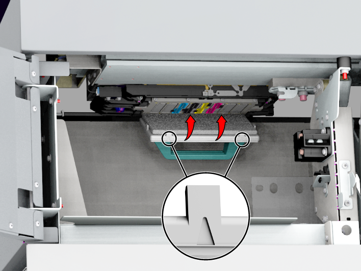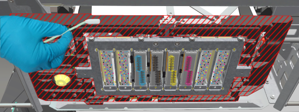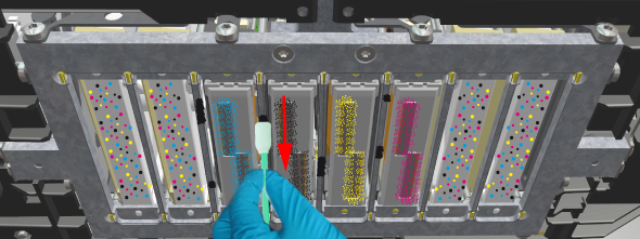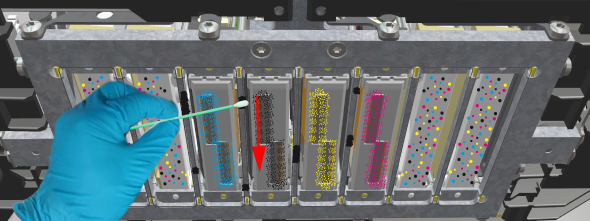 Je-li mezi tiskovými hlavami usazený inkoust, musíte znovu provést čištění od kroku 8 s novou pěnou. Podívejte se na skvrny v červených kruzích na obrázku. |