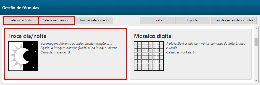 Clique numa fórmula para a selecionar. Para selecionar todas as fórmulas, clique no botão [Selecionar tudo]. Clique em [Selecionar nenhum] se desejar desselecionar todas.