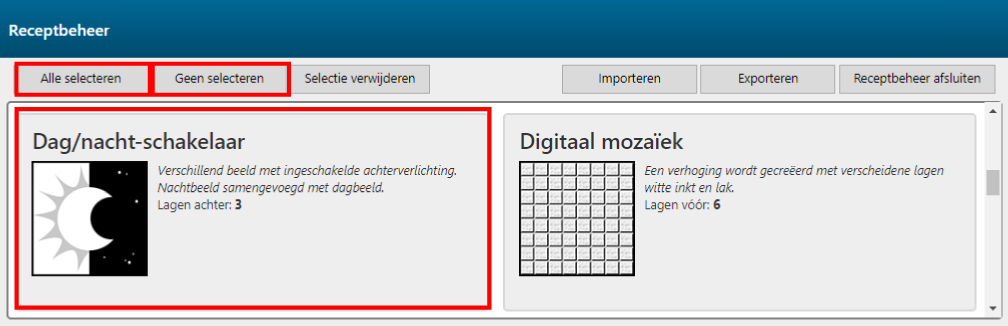 Klik op een recept om het te selecteren. Om alle recepten te selecteren, op de knop [Alle selecteren] klikken. Klik op [Geen selecteren] als u alle selecties ongedaan wilt maken.