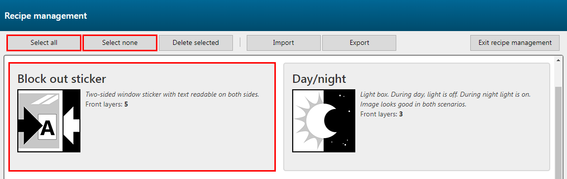 按一下一個配方進行選擇。若要選擇所有配方,請按一下 [選取全部] 按鈕。如果您想取消全選,請按一下 [一個也不選] 。