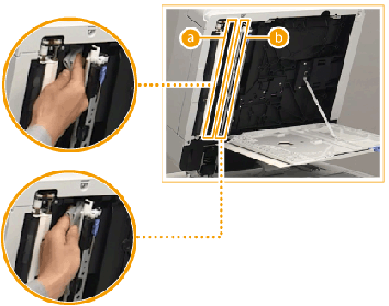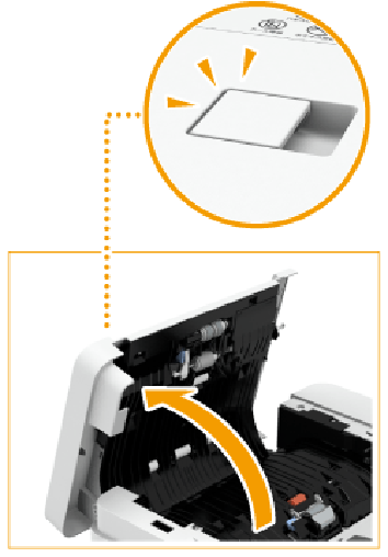 Pull the top lever of the automatic document feeder to open the inner side of the document scan cover. Open the document scan cover carefully to prevent scratches on the glass plate. Clean the thin glass strip of the scan area. Then, wipe dry with a clean, dry cloth. |