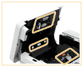 Clean the rollers at the indicated areas. Then, wipe dry with a clean, dry cloth. |