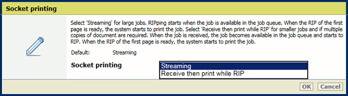 Use the [Socket printing] setting to indicate when the RIP starts to process jobs that use the socket printing port.