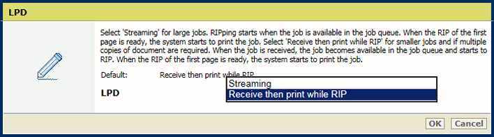 [Receive, then print while RIP is in progress] is the default value and is applicable to smaller jobs that have multiple sets. The RIP starts to process the jobs after they arrive in the print queue and before the whole job has been received.