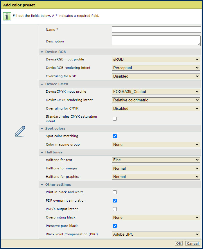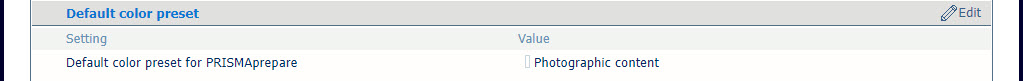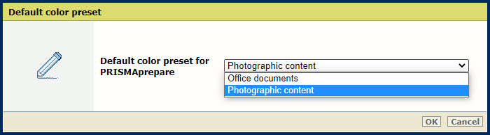 [Prédéfinition de couleurs par défaut] Utilisez le paramètre [Préréglage de couleur par défaut pour PRISMAprepare] pour définir le préréglage de couleur par défaut pour PRISMAprepare.