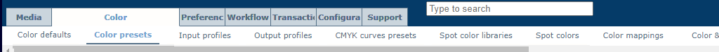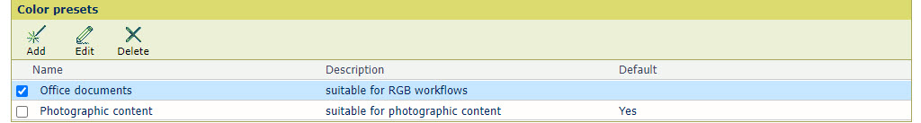 Un préréglage de couleur est composé d’une série de paramètres de couleur prédéfinie. Les préréglages de couleurs permettent de sélectionner facilement les bons réglages de couleurs pendant la définition du travail. La liste des préréglages de couleur est disponible dans PRISMAprepare, les cycles de traitement automatisés, PRISMAsync Remote Manager, PRISMAsync Remote Printer Driver et sur le panneau de commande.