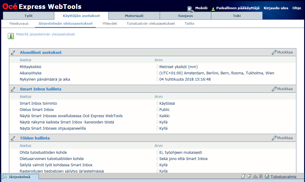 Asetusten [Käyttäjän asetukset] – [Järjestelmän oletusasetukset] avulla voit määrittää järjestelmän asetukset ja työnkulkuun liittyvät asetukset.