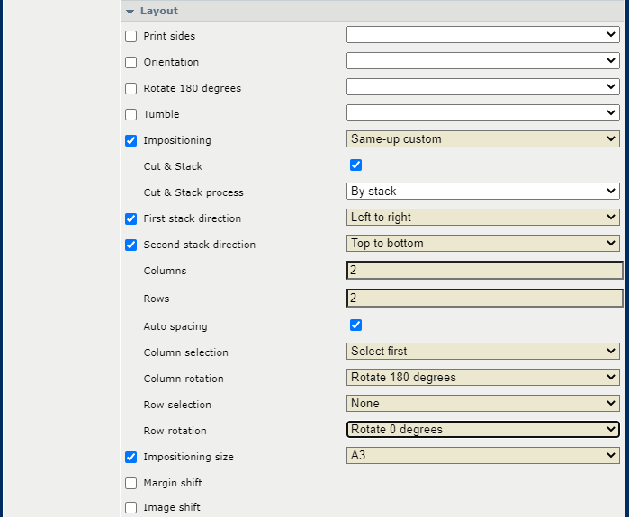 You can set [Impositioning] to [Same-up custom] only when your printer has the Advanced Impose licence installed.