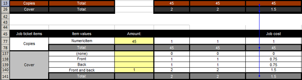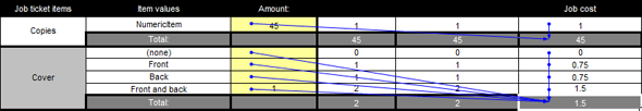 A new formula is created in column Z. The new formula is based on two [Job ticket items]: [Copies] and [Cover]. In this procedure, the new formula is tested for correctness.