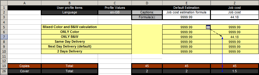 En ny formel opprettes i kolonne Z. Den nye formelen bygger på to [Jobbkortelementer]: [Kopier] og [Omslag]. I denne prosedyren testes det at formelen er korrekt.
