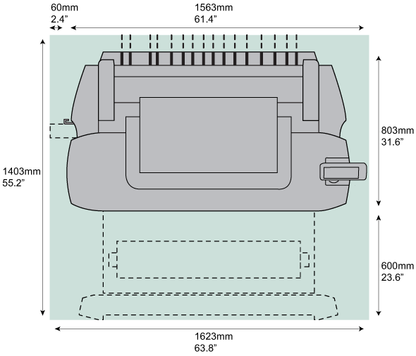 Tulostusjärjestelmä (lisävarusteluun kuuluvan in kanssa tai ilman sitä) vaatii tietyn lattiatilan/työalueen alla olevan kuvan mukaisesti.
