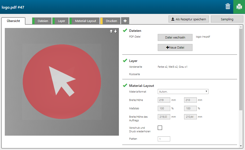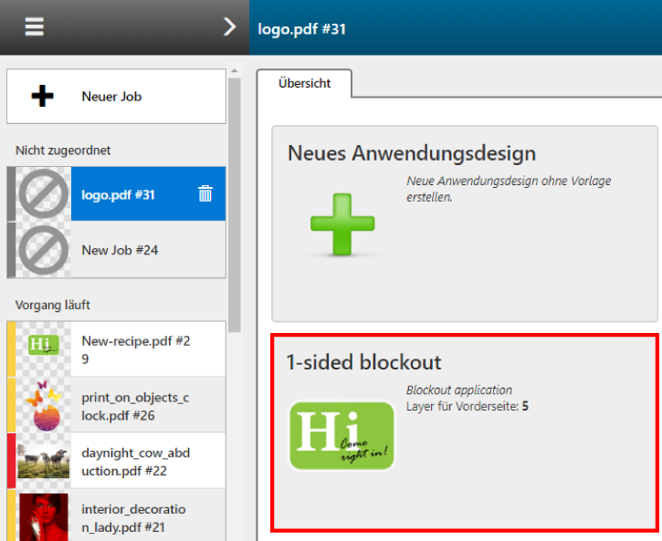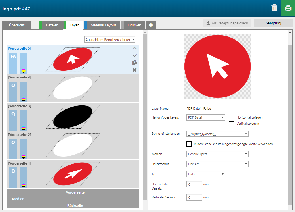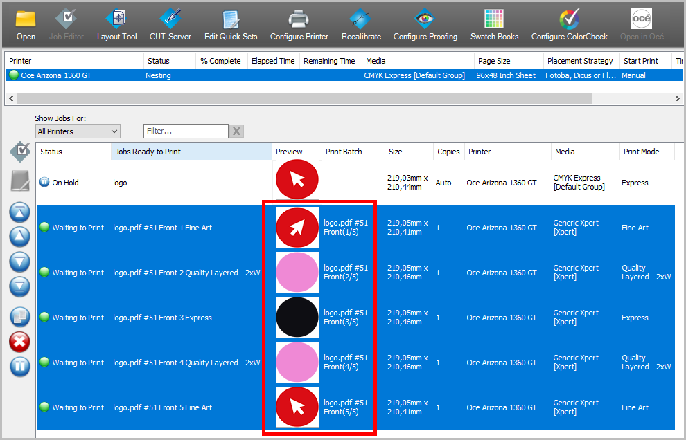 Die Reihenfolge der Druckaufträge in RIP Queue ist nicht von Bedeutung. In den Einstellungen für den Stapelauftrag ist festgelegt, in welcher Reihenfolge die Layer gedruckt werden sollen.