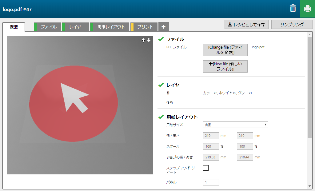 このセクションでONYXジョブから、前述のセクションで作成した新しいレシピを使用してアプリケーションを印刷する方法を説明します。