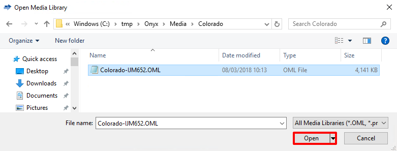 Nejdříve si stáhněte profil média Colorado 1630 uložený v souboru knihovny médií (*.OML nebo *.prninst včetně ovladače) pro ONYX.