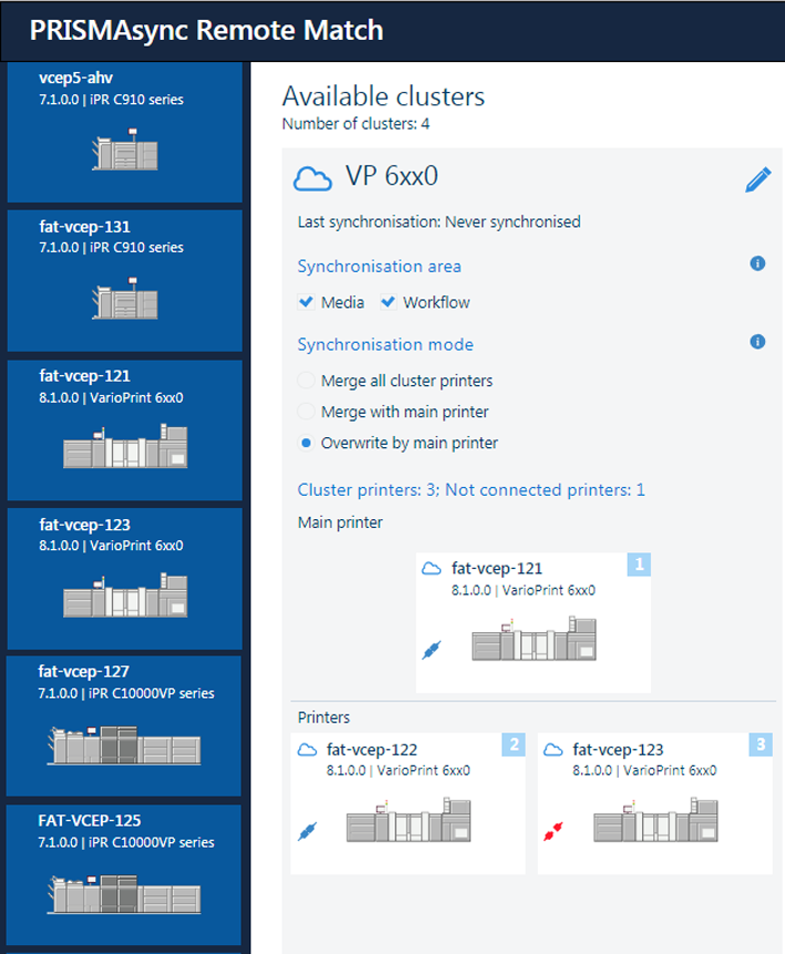 PRISMAsync Remote Match er et skybaseret program, der kan justere konfigurationen af farve (printerafhængig), medie og arbejdsgang for lignende printere i printerflåden. Printere, der tilhører den samme printerserie, og som har den samme version af printersoftwaren, kan grupperes i en klynge.