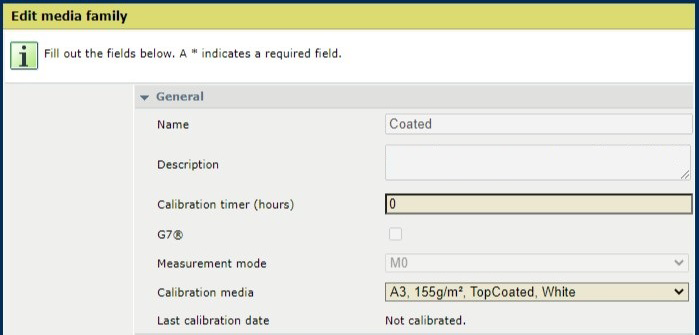 Por predefinição, o temporizador de calibragem para uma família de materiais está desativado (definido como 0). Se o temporizador da calibragem para uma família de materiais estiver desativado, a calibragem da família de materiais não será executada como parte das tarefas de cor automatizadas.