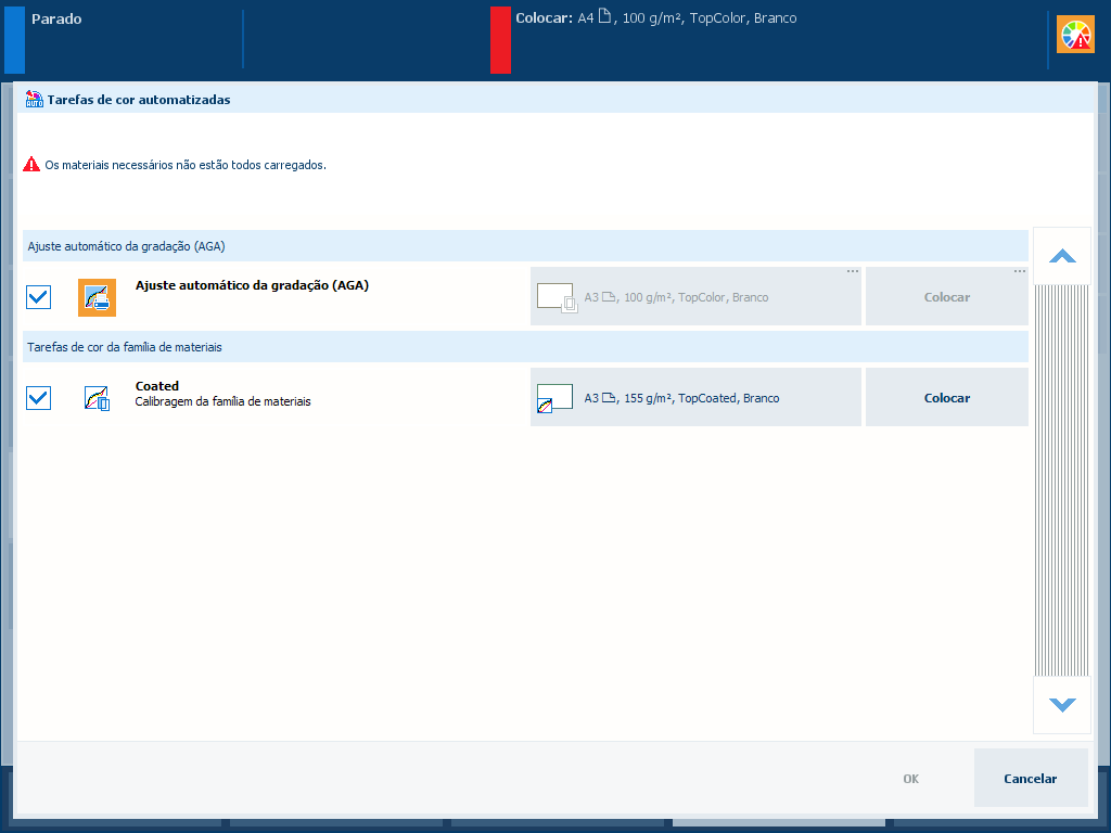 Depois de concluídas as tarefas de cor automatizadas, é apresentada uma descrição geral das tarefas efetuadas no painel de controlo. Quando uma tarefa falha, é marcada com um sinal de aviso. Consoante a definição no Settings Editor, será impresso um relatório com a descrição geral das tarefas.