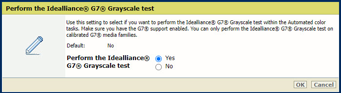 Utilize a definição [Realizar o teste de escala de cinzentos Idealliance® G7®] para especificar se o teste de escala de cinzentos Idealliance® G7® é executado após uma calibragem da família de materiais G7®.