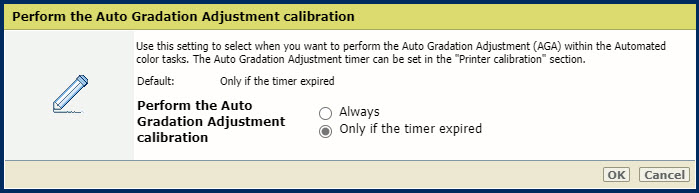 [Automaattiset väritehtävät] -osa[Suorita automaattisen liukuvärien säädön kalibrointi] -asetuksella voit määrittää, milloin automaattinen liukuvärien säätö suoritetaan.