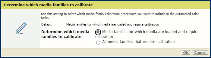 Määritä [Määritä kalibroitavat materiaaliperheet] -asetuksella, mitkä materiaaliperheen kalibrointitoimet tehdään automaattisissa väritehtävissä.