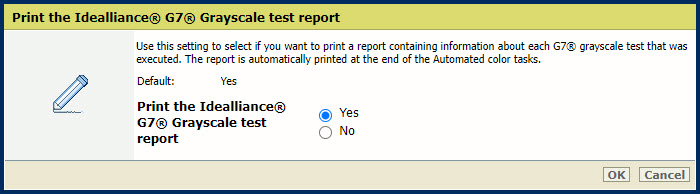 [Suorita Idealliance® G7® Grayscale -testi] -asetusMääritä [Tulosta Idealliance® G7® Grayscale -testiraportti] ‑asetuksella, haluatko tulostaa Idealliance® G7® Grayscale ‑testin raportin Idealliance® G7® Grayscale ‑testin suorittamisen jälkeen.