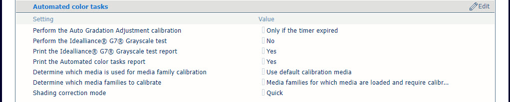 Määritä [Suorita Idealliance® G7® Grayscale -testi] ‑asetuksella, suoritetaanko Idealliance® G7® Grayscale ‑testi G7®-materiaaliperheen kalibroinnin jälkeen.