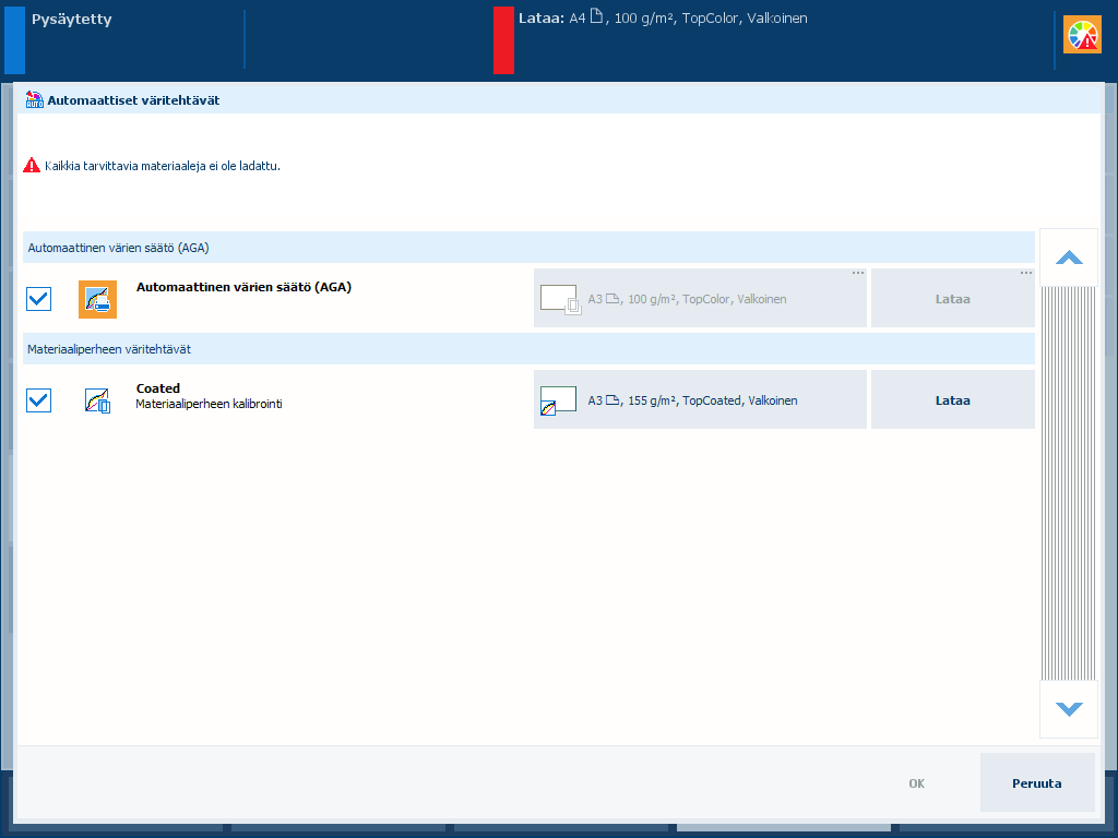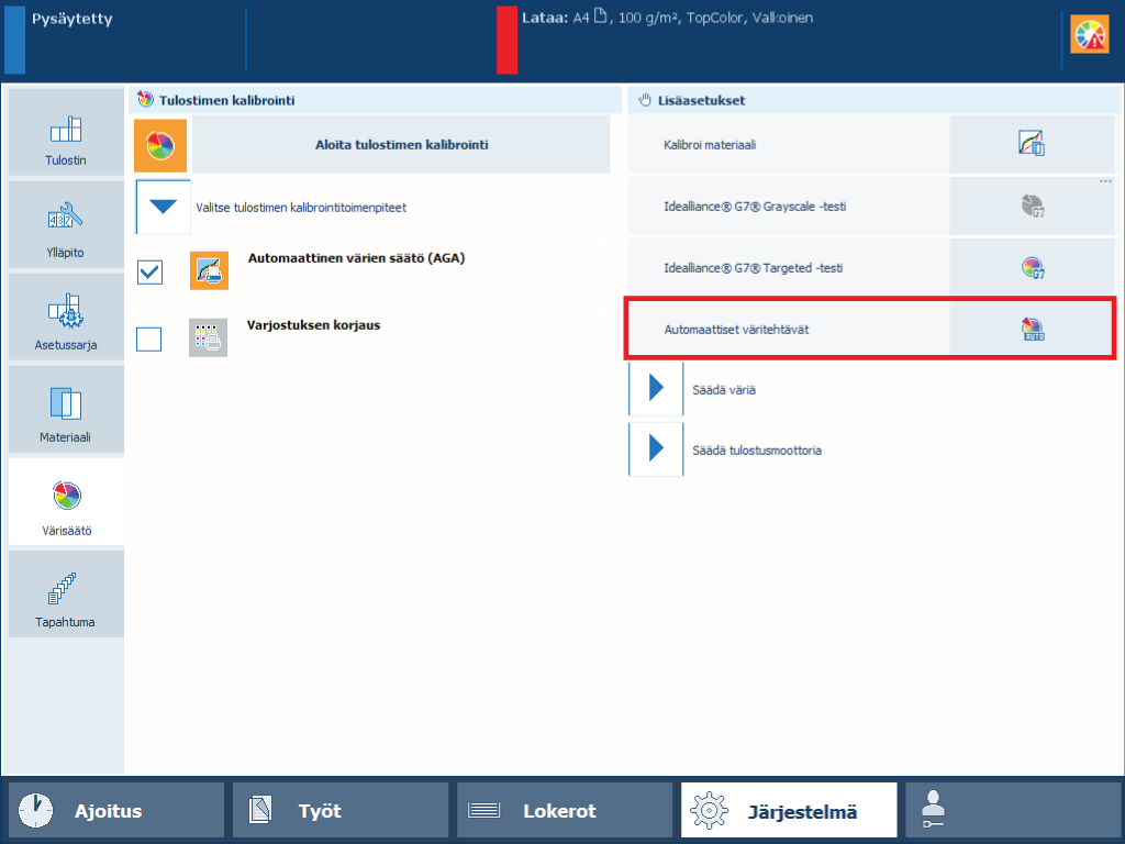 Tämä on helpoin tapa varmistaa, että kaikki materiaaliperheet kalibroidaan. Jos sinulla on enemmän materiaaliperheitä kuin paperilokeroita, sinun on suoritettava automaattiset väritehtävät useamman kerran.