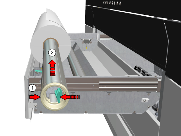内側へ印刷する場合、両方の用紙の位置を使用します。ロール紙を用紙位置2へセットします。2本目のロール紙を用紙位置1で使用することはできません。