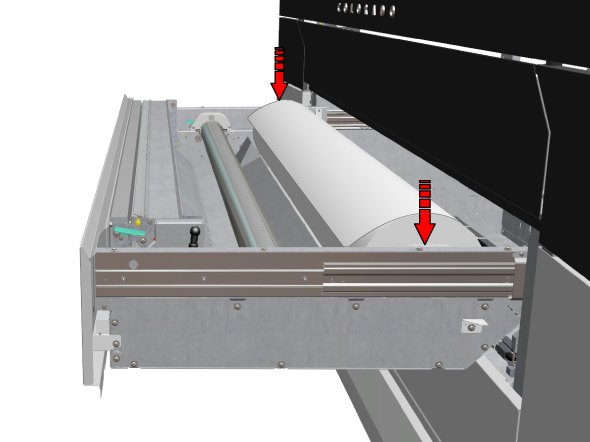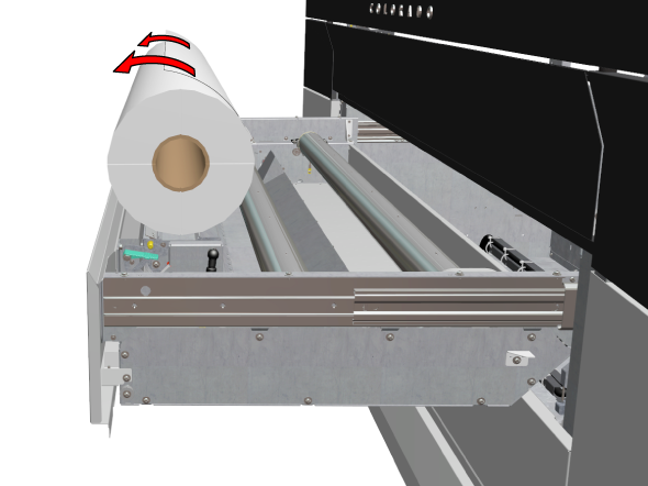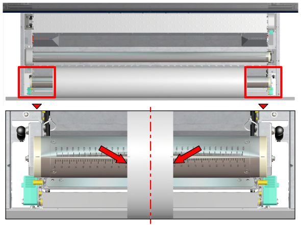 用紙が芯に均等に巻き上げられているか必ず確認してください。均等に巻き取られていない(スライド調節されていない)用紙は、本機に損傷を与えるおそれがあるため、ロードしないでください。