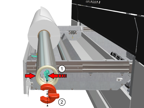 用紙シャフトを新しいロール紙のコア側の中にスライドさせます(2)。
