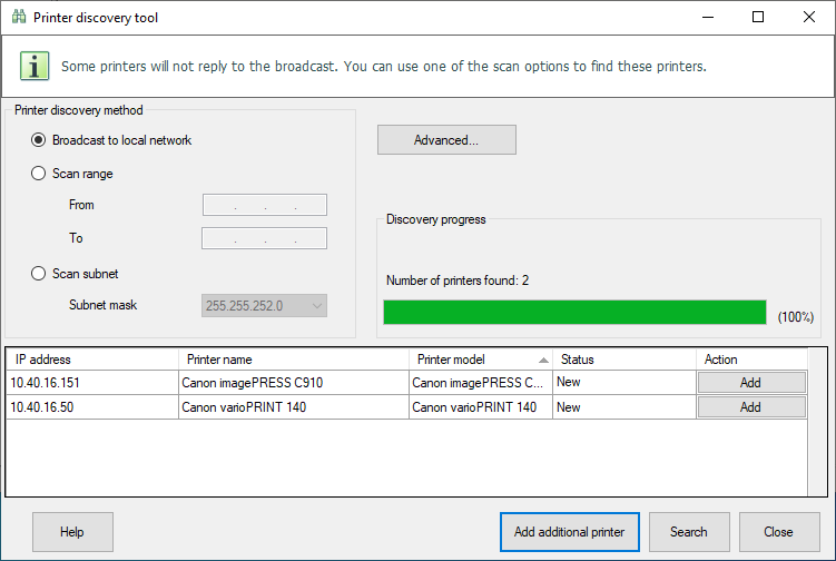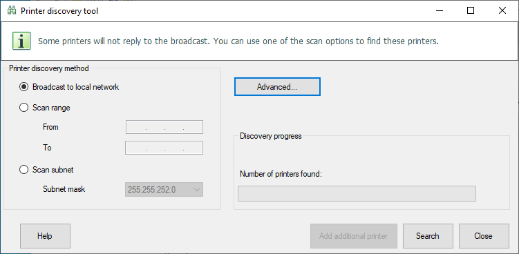 Vous pouvez détecter des imprimantes sur le réseau par diffusion, par numérisation d'une plage d'adresses IP ou par la définition d'un masque de sous réseau. Par défaut, la plage d'adresses IP et le masque de sous-réseau sont récupérés à partir de l'adresse IP locale et du masque de sous-réseau local de Windows.