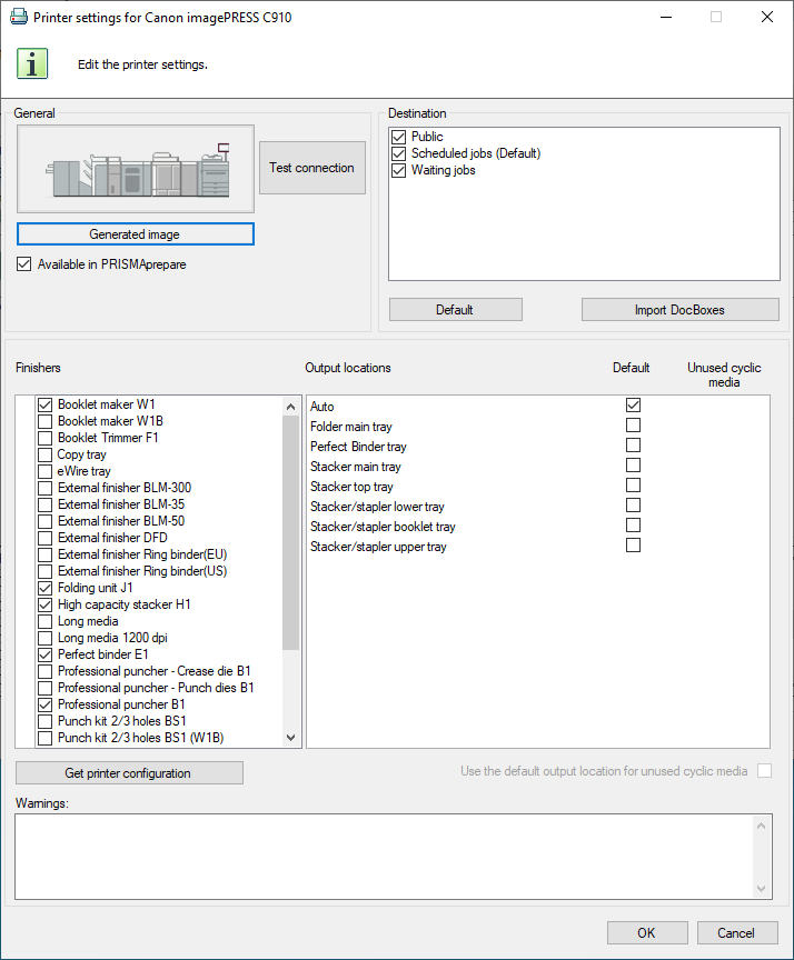 Du kan konfigurera skrivaren när den är installerad och tillgänglig för PRISMAprepare. Till exempel kan du välja utskriftsköer (destination), efterbehandlare och utmatningsplatser för efterbehandlarna.