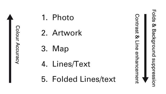 Brukes til originaler med store fargeområder som også inkluderer linjer og finere detaljer. For et bredt utvalg av originaler er denne måten den beste balansen mellom fargenøyaktighet og linjeforbedring. |
