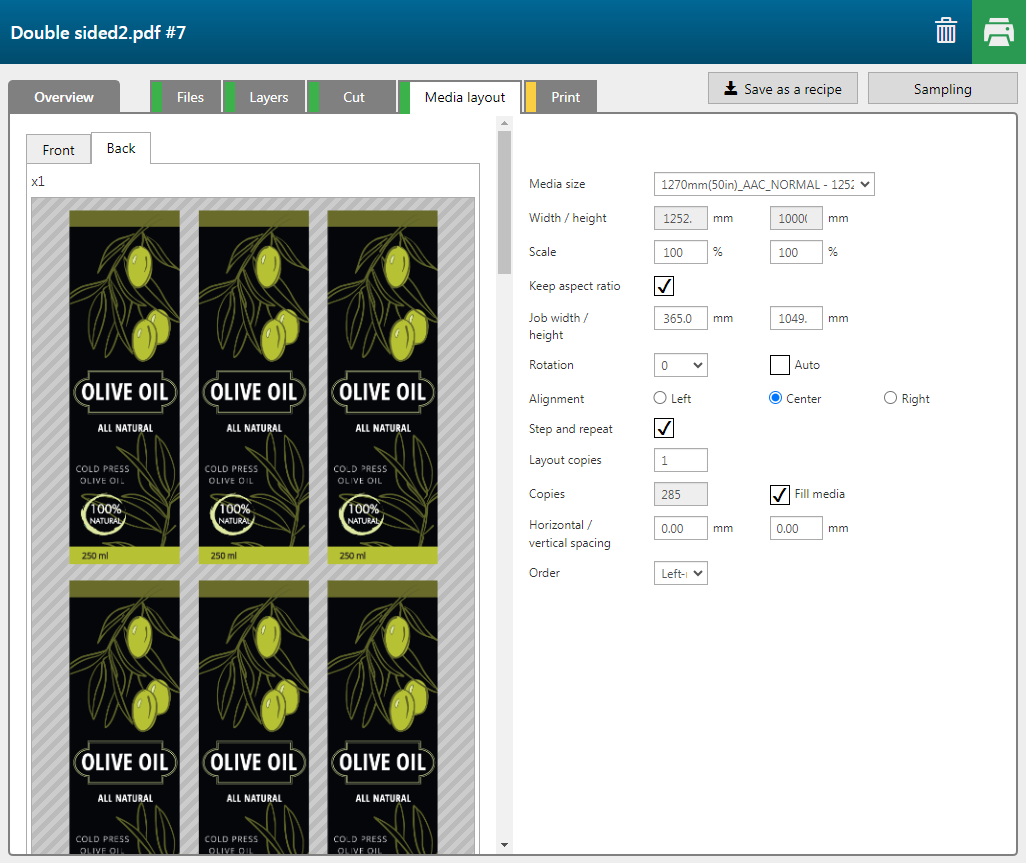 Geben Sie die gewünschte Anzahl von Kopien an, oder aktivieren Sie das Kontrollkästchen [Träger füllen], um die Software berechnen zu lassen, wie viele Kopien unter Berücksichtigung der übrigen Einstellungen auf dem ausgewählten Materialformat untergebracht werden können. |