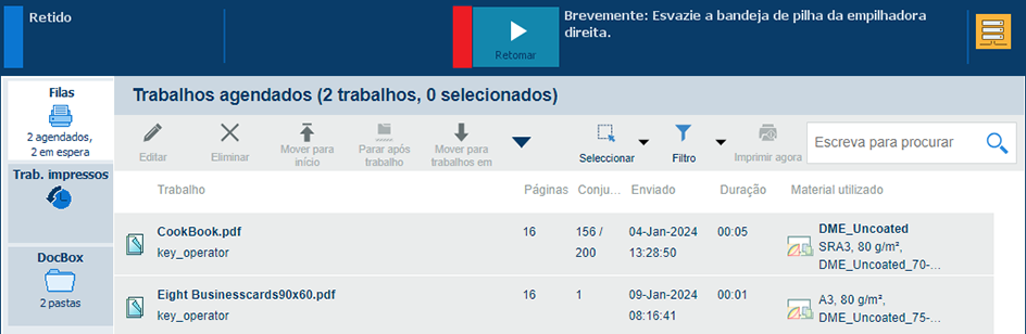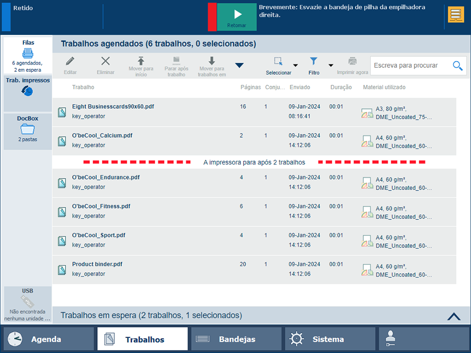 Existem diferentes formas de parar ou atrasar a produção de impressões com o botão para parar ou com a função parar após trabalho.